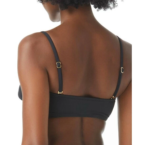 Sleek and chic with a sharp bandeau neckline, Vince Camuto’s bikini top features a shimmery metallic colorblock design for modern appeal.