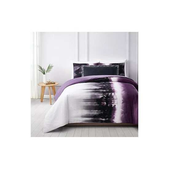 Striking abstract print with contrasting pure white and dusty purple solid colors are separated by a muddled bouquet stripe in this 100% cotton bedding pattern.
