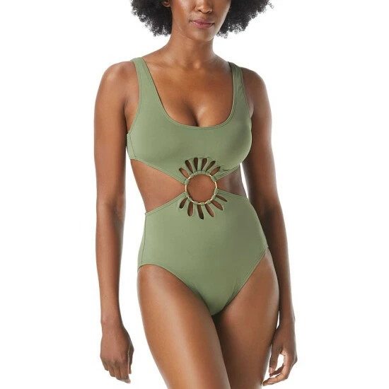 Front and center, cutouts cluster around a signature O-ring in Vince Camuto’s one-piece with open sides and a clasp back strap.