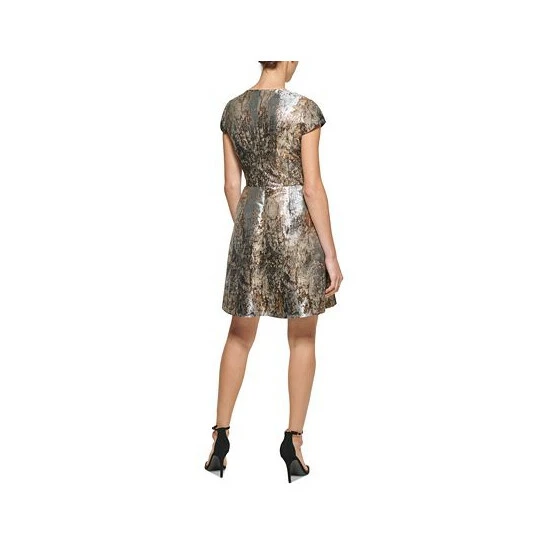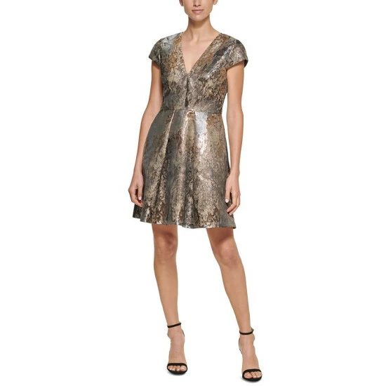 A mix of textured metallic hues gives a special glow to a party-goer in this petite V-neck dress from Vince Camuto.