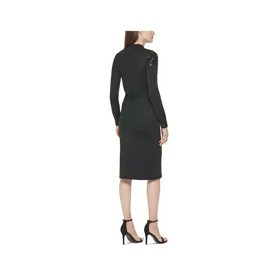 Shimmery sequins at the shoulders and bodice bring a festive flavor to this sleek petite sweater dress from Vince Camuto.