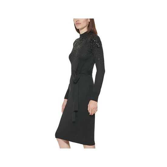 - Sequined detail at bodice front and sleeves; tie belt at waist