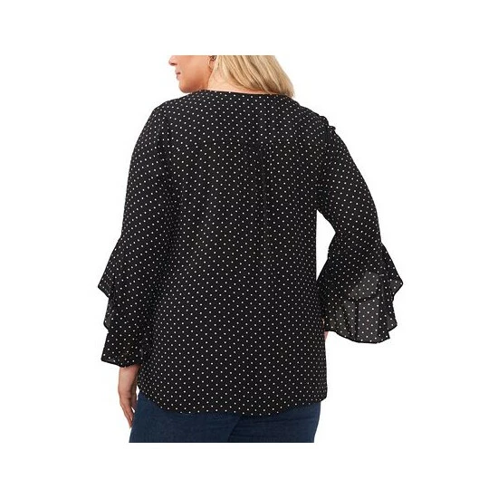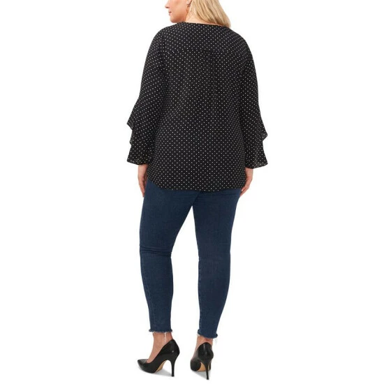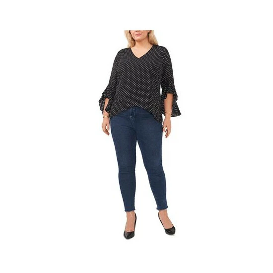 Vince Camuto combines the beauty of fluttery sleeves with the style of a crossover hem on this printed plus size top.