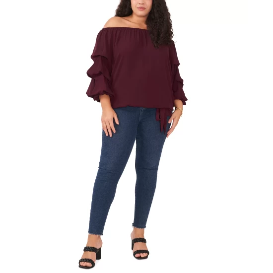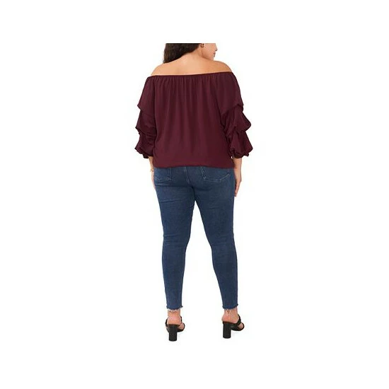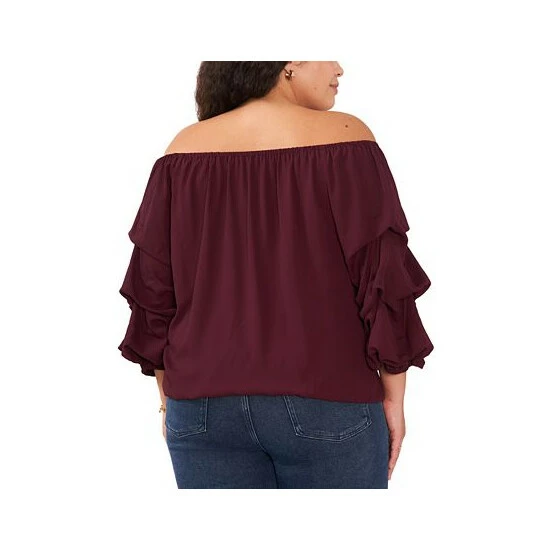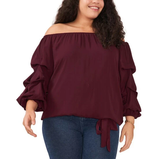 The cinched tiers on the off-the-shoulder sleeves of this plus size Vince Camuto top brings a stylish twist to your wardrobe that you can dress up or down to meet your fashionable needs.
