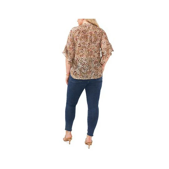 Blend bohemian print with feminine flutter sleeve detail on this plus size Vince Camuto blouse and give your wardrobe a stylish refresh.