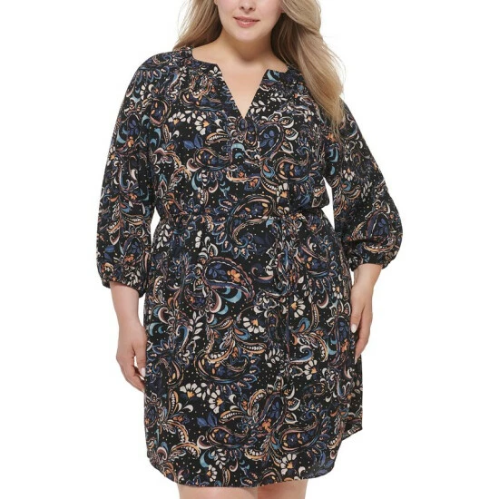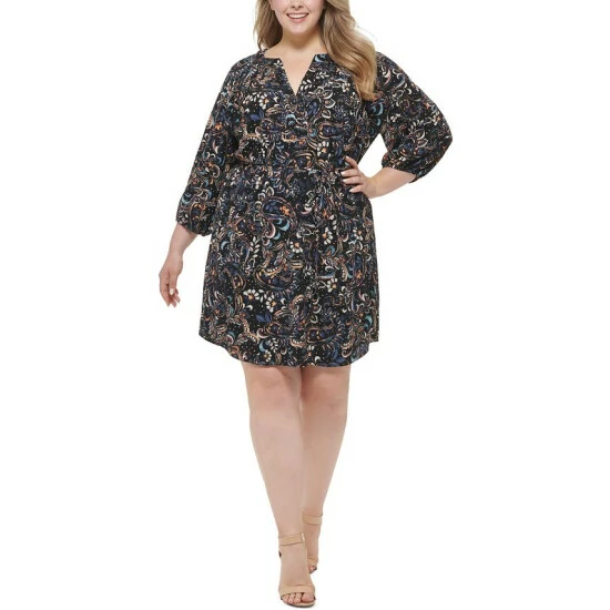 A striking pebble crepe print is cinched at the waist with a slim belt in this chic plus size shift with flowy sleeves from Vince Camuto.
