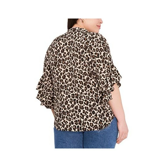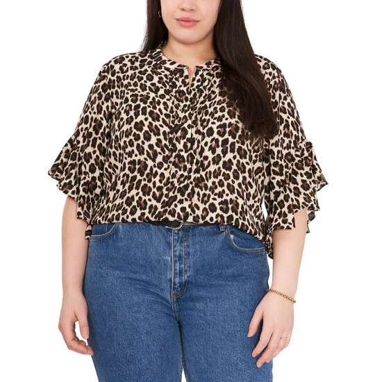 A classic henley with updated flutter sleeves, this plus size top from Vince Camuto is featured in a fierce animal print for a standout look every time.