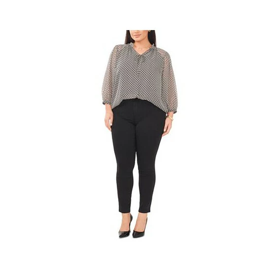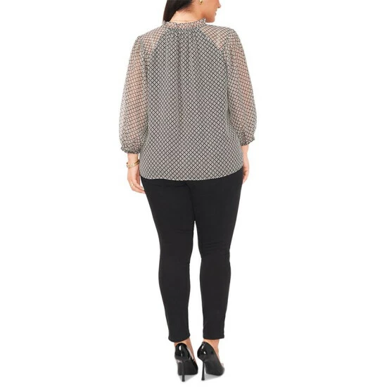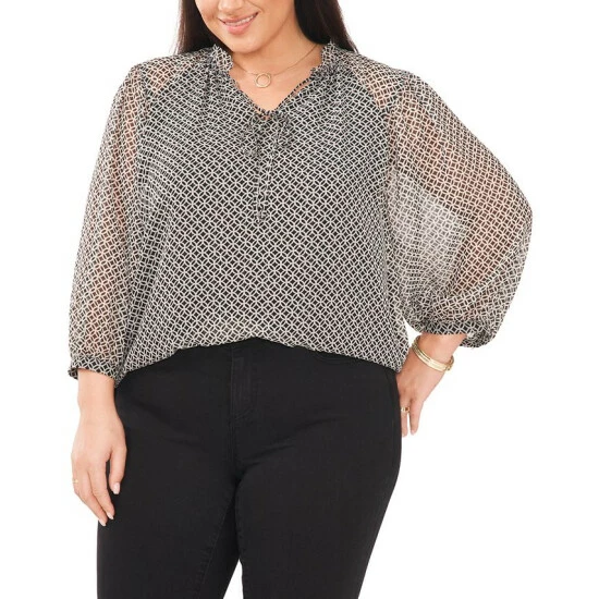 Take your look in a boho-inspired direction with this plus size peasant top from Vince Camuto, a printed pick designed with ties at the neckline.