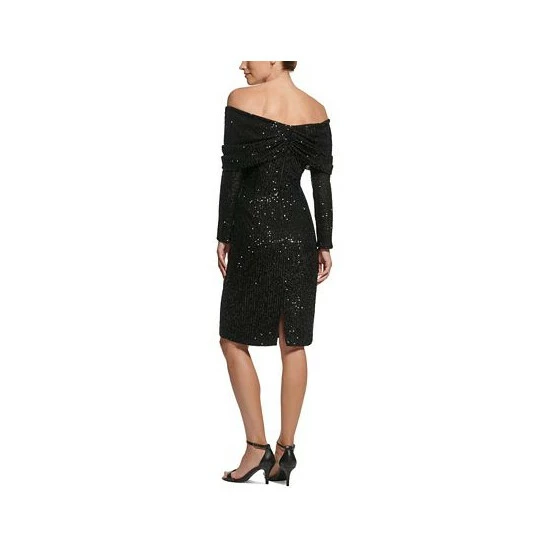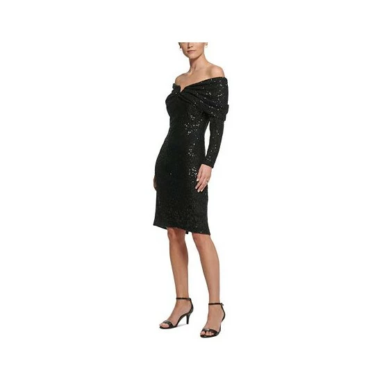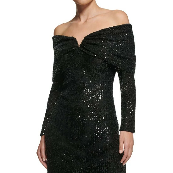 - Notch off-the-shoulder neckline; Sheath silhouette