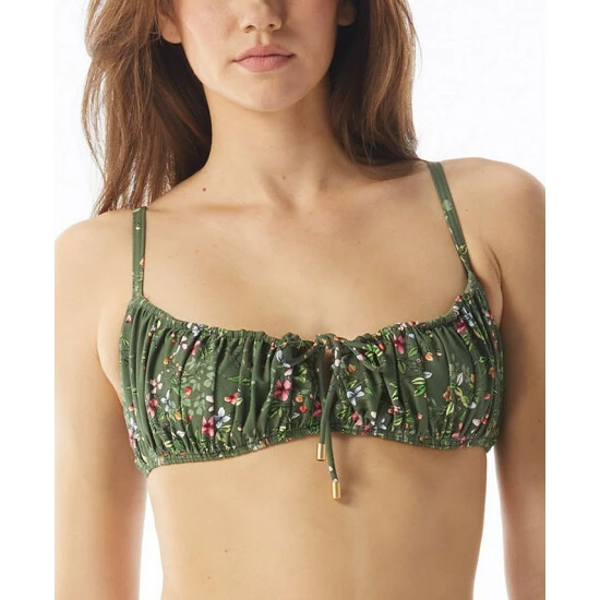 A pretty floral print in fresh tones updates this sweet look from Vince Camuto, a bikini top with soft gathers and a tie between the bust.